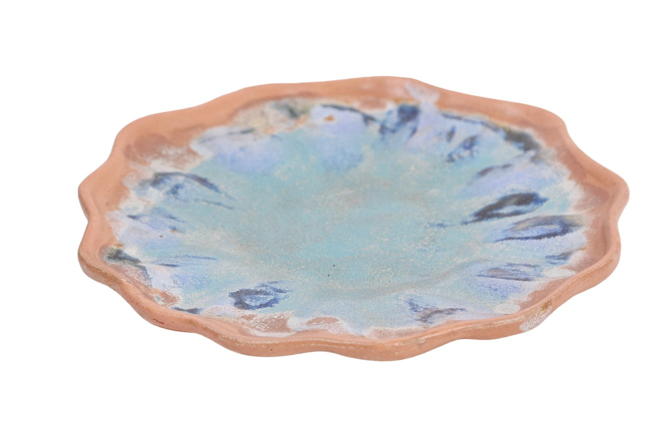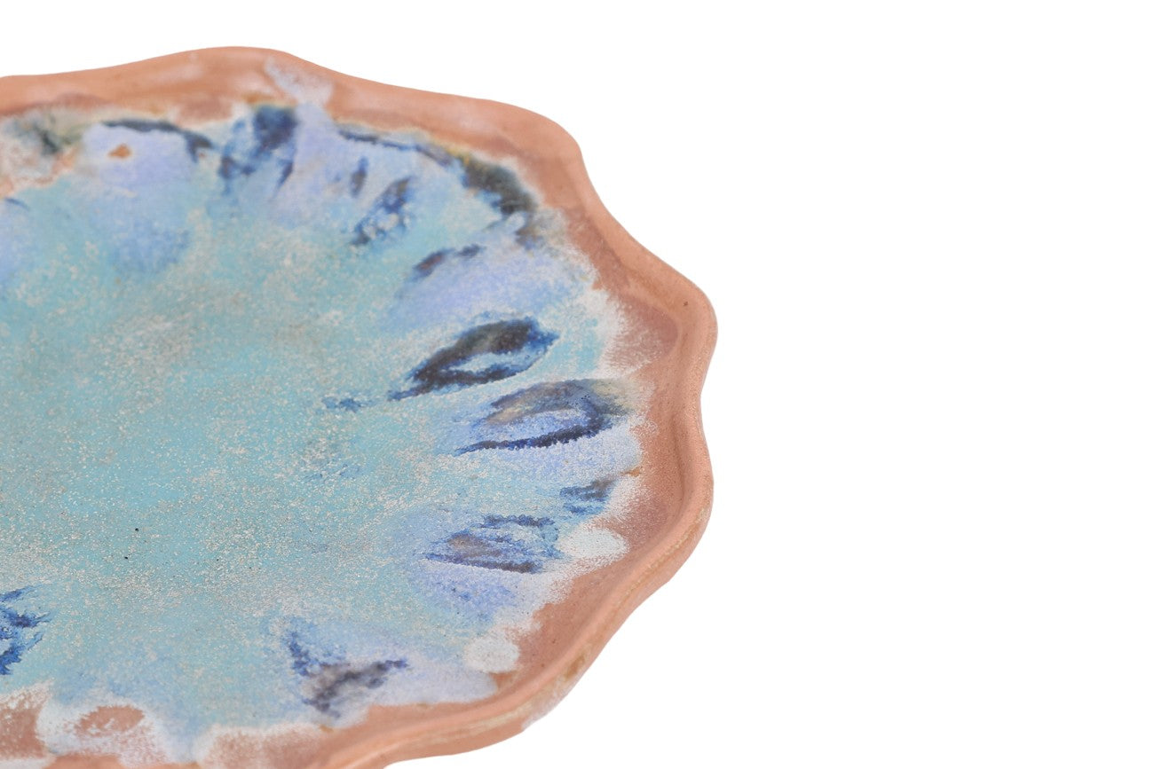 Cuidadosamente feito à mão, cada prato revela um padrão único semelhante ao dos corais, com pinceladas em tons de turquesa, aqua e areia, evocando o fundo do mar. Sua borda orgânica e irregular reforça o apelo natural, tornando-o um centro de mesa perfeito ou um elemento decorativo marcante em ambientes com inspiração costeira.